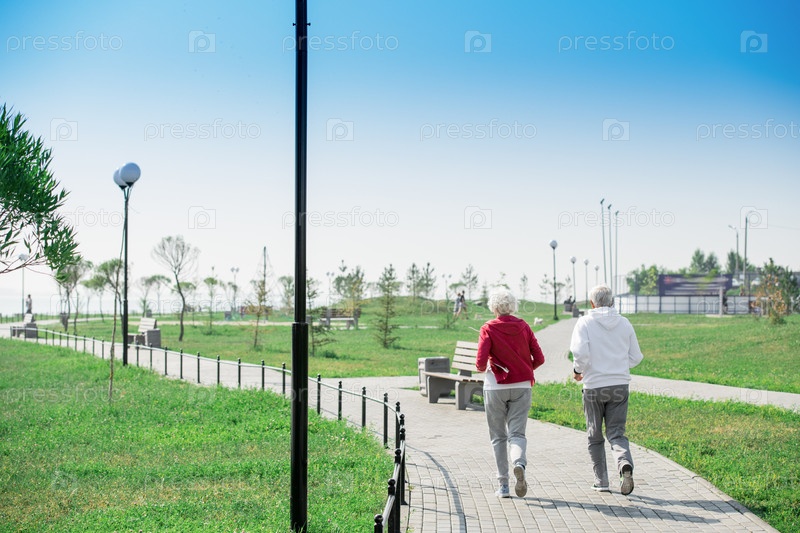 Старшие пары бегут в парке Active Back View