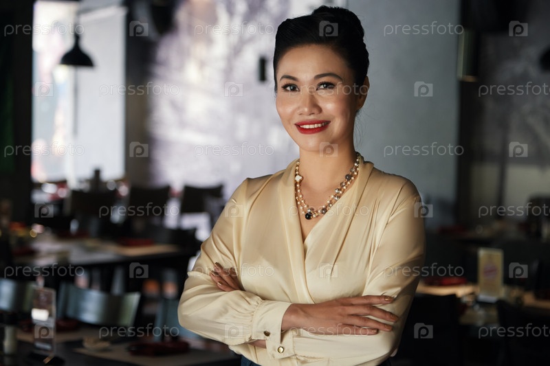 Счастливая элегантная азиатская женщина, стоящая в ресторане