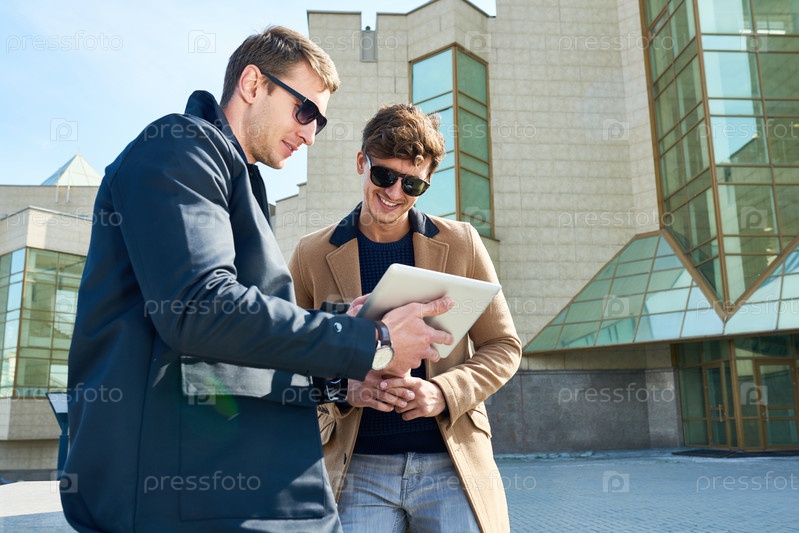 Два красивых мужчины используют планшеты на открытом воздухе
