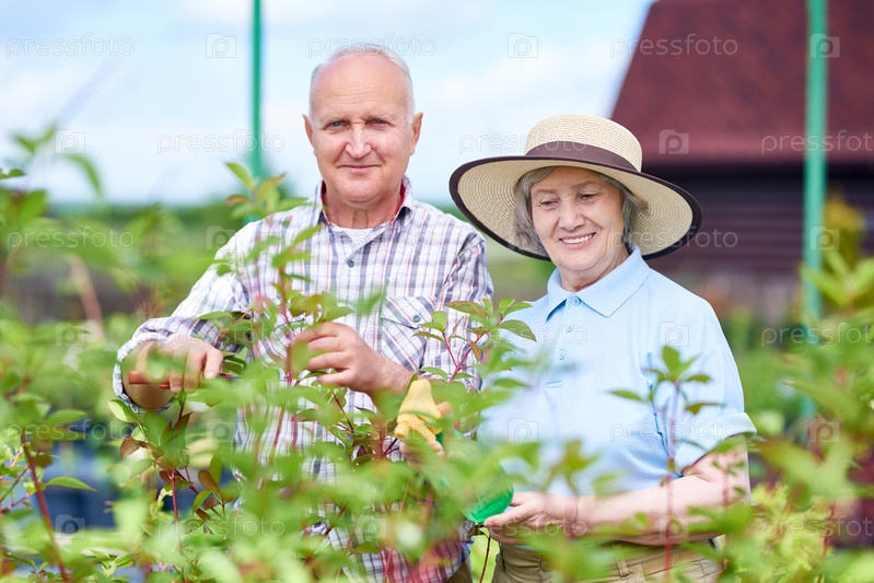 Пара старших фермеров в саду