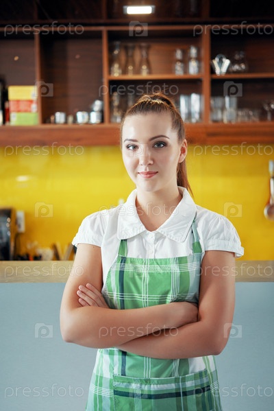 Молодая женщина в фартуке работает в кафе