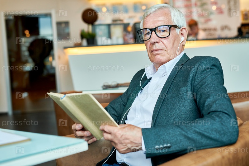 Пенсивный старший мужчина читает книгу в кафе