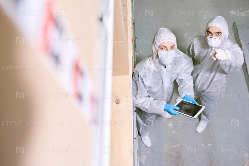 Работник хранилища, указывающий на коллегу с планшетом
