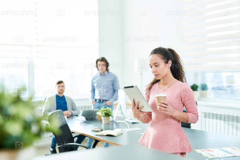 Испанская менеджерка читает бизнес-статью на планшете