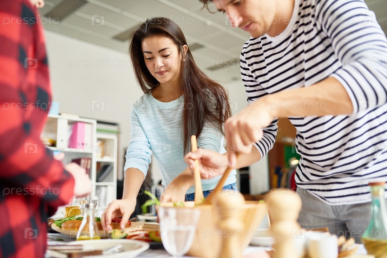 Друзья, устанавливающие обеденный стол