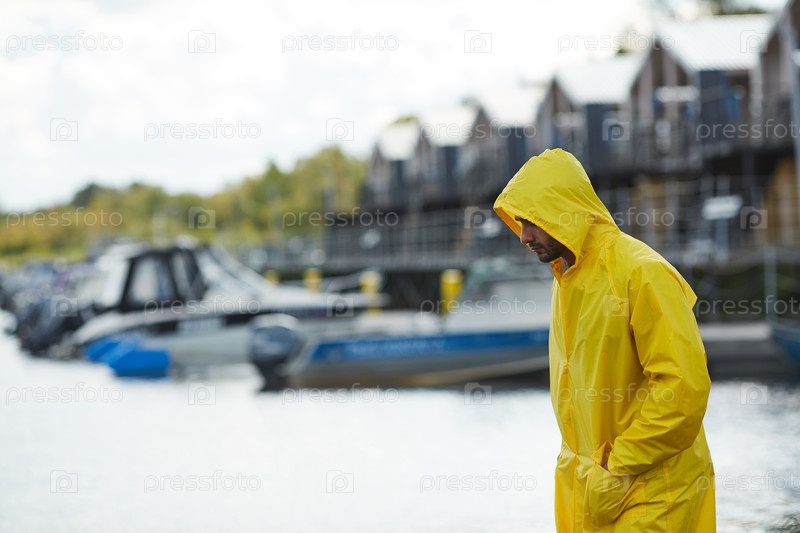 Печальный рыбак в желтом водонепроницаемом пальто движется вдоль пирса