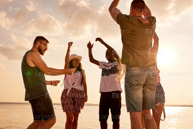 Взволнованный мультиэтнический друг танцует на береговой линии