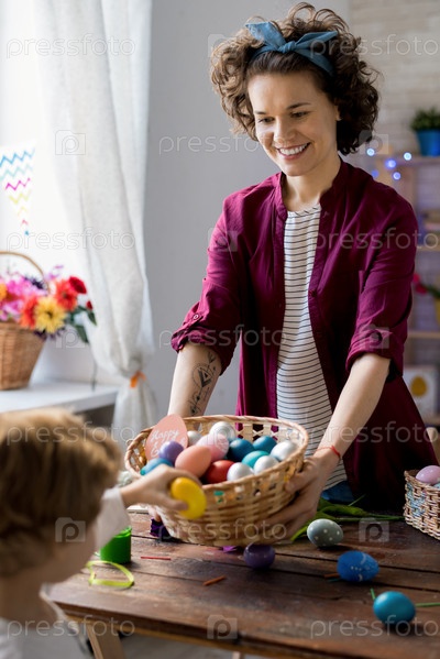 Молодая женщина раздает пасхальные яйца
