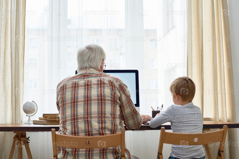 Дедушка помогает ребенку с домашними заданиями