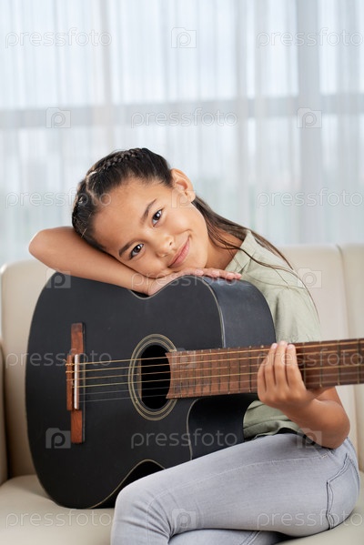 Азиатская девушка с гитарой на диване