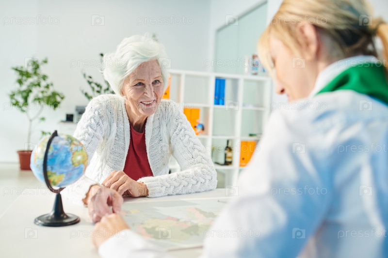 Счастливый старший клиент выбирает направление путешествия с менеджером