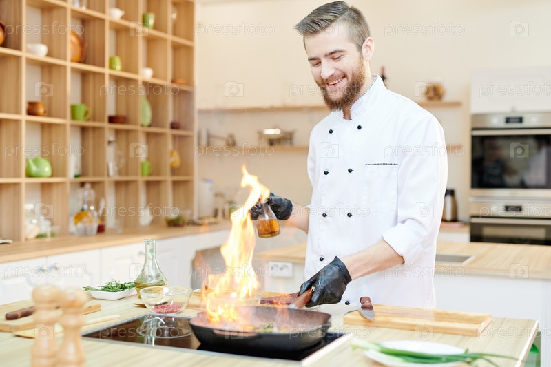 Веселый шеф-повар, готовящий Фламб