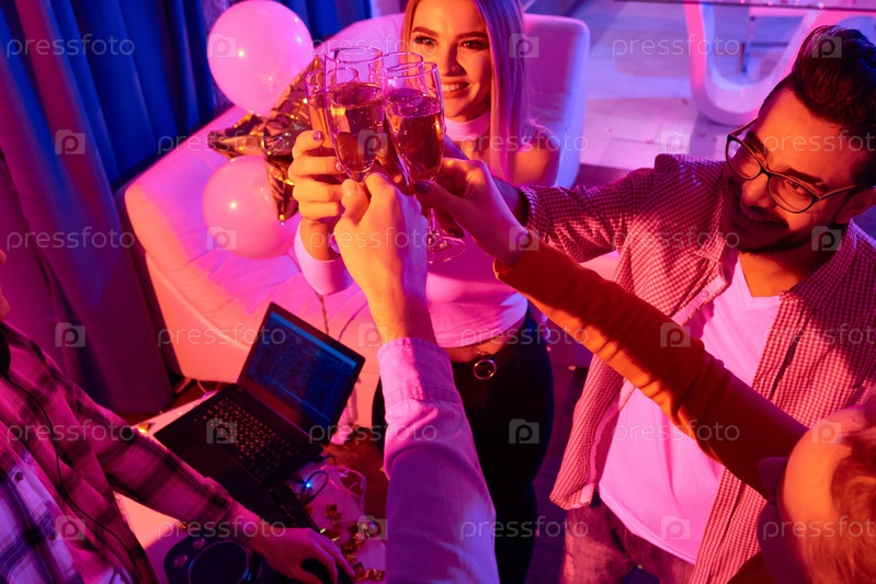 Люди бьют бокалы с шампанским на частной вечеринке