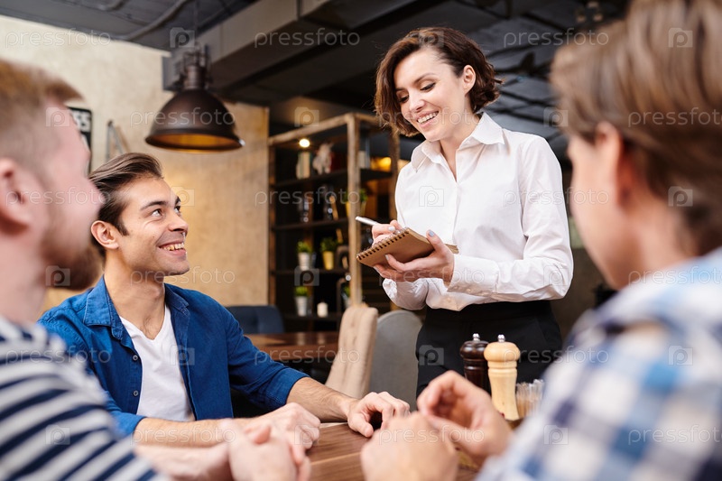 Улыбающаяся официантка делает заметки, принимая заказы