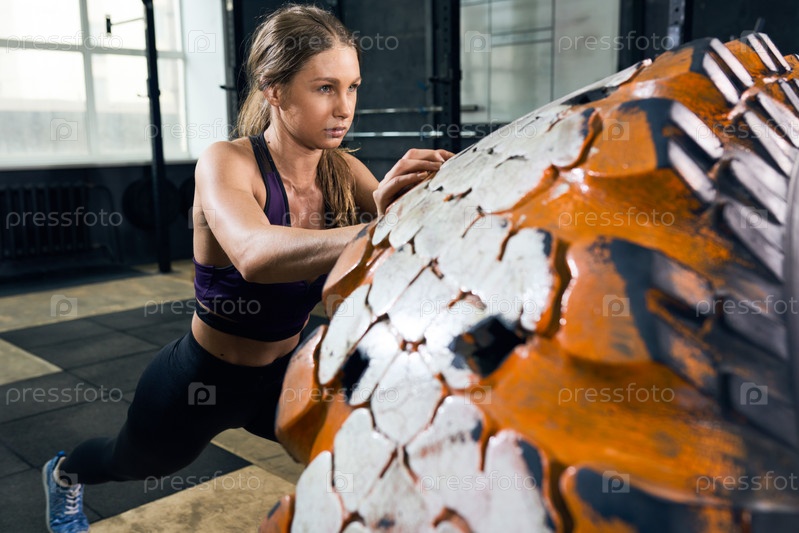 Женщина, переворачивающая шину в тренажерном зале