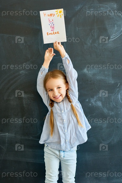 Радостная маленькая девочка, держащая пасхальную поздравительную карточку