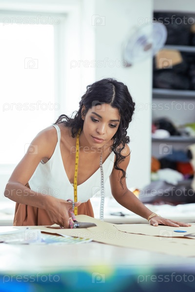 Швея режет ткань ножницами