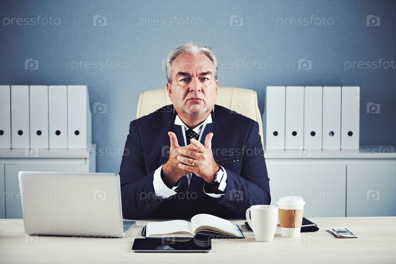 Пожилой бизнесмен думает, сидя в офисе