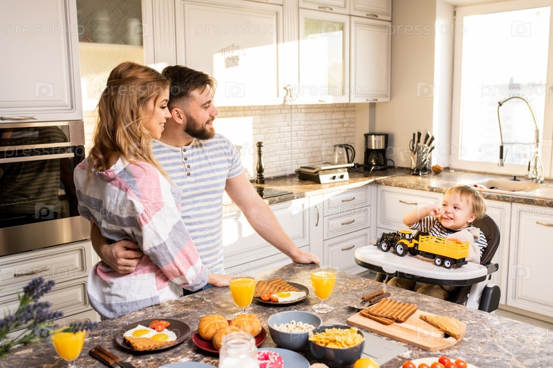 Счастливая молодая семья на кухне