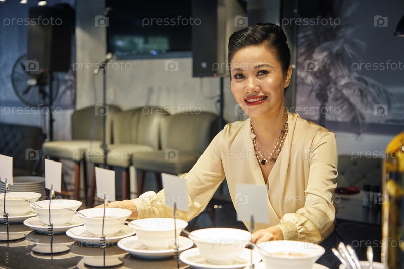 Улыбающаяся азиатская женщина принимает еду из буфета