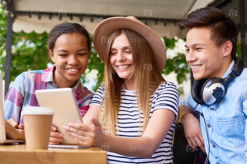Молодые люди, использующие компьютерные устройства в современном кафе