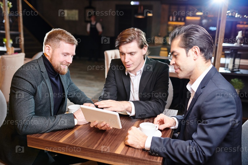 Бизнесмены смотрят презентацию во время перерыва на кофе