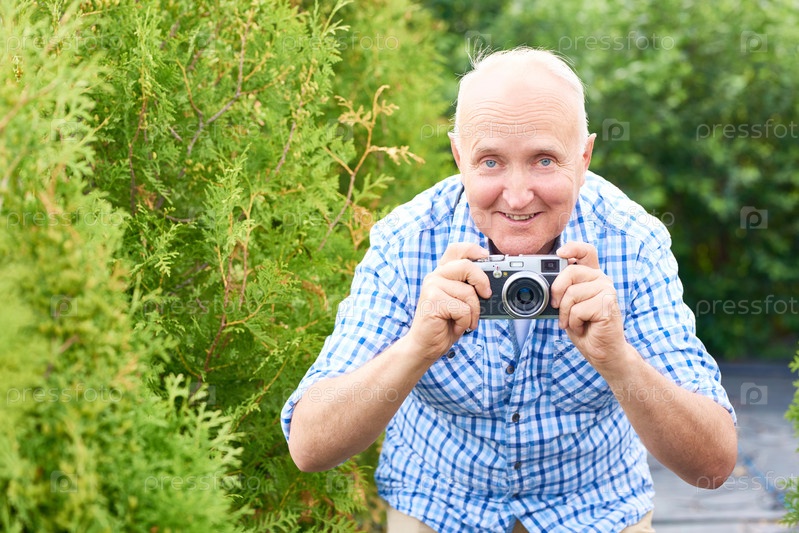 Счастливый старший мужчина фотографирует в парке