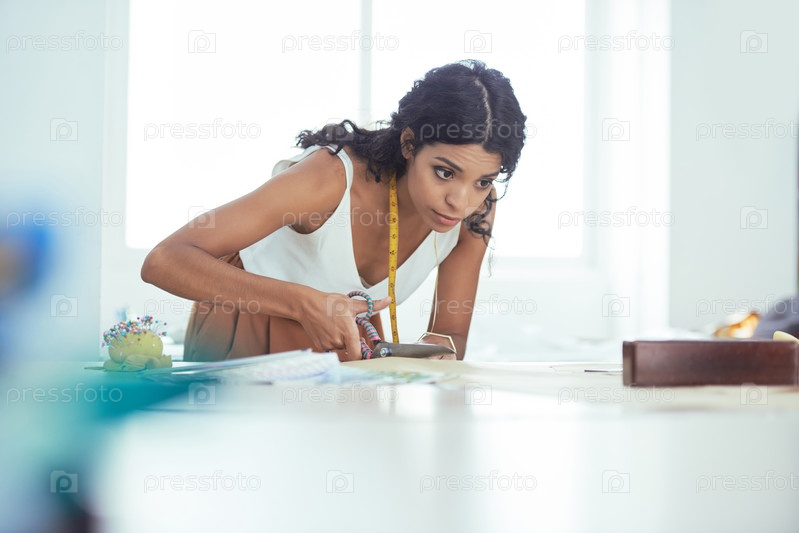 портной, работающий с тканями за столом в ателье