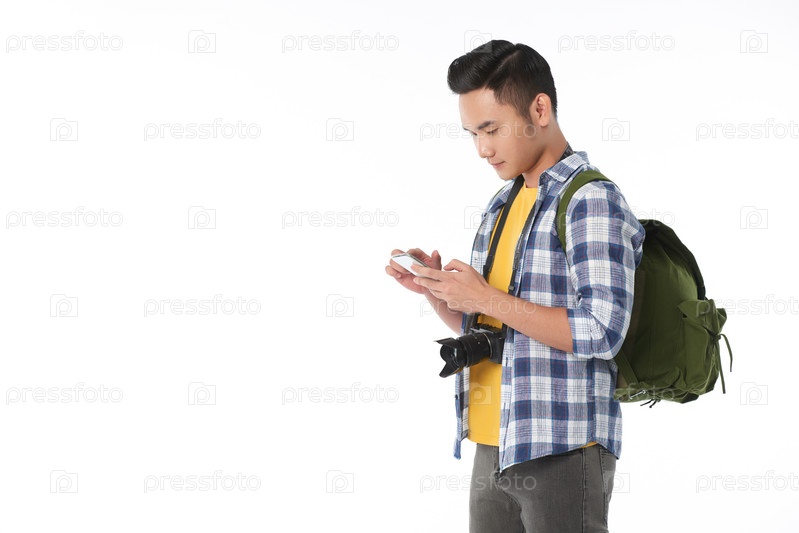 Красивый турист использует смартфон