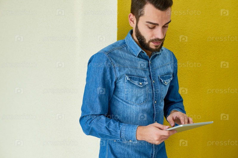 Бородатый бизнесмен использует цифровой планшет
