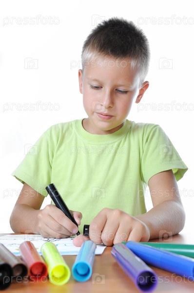 Мальчик рисует цветными фломастерами на белом фоне