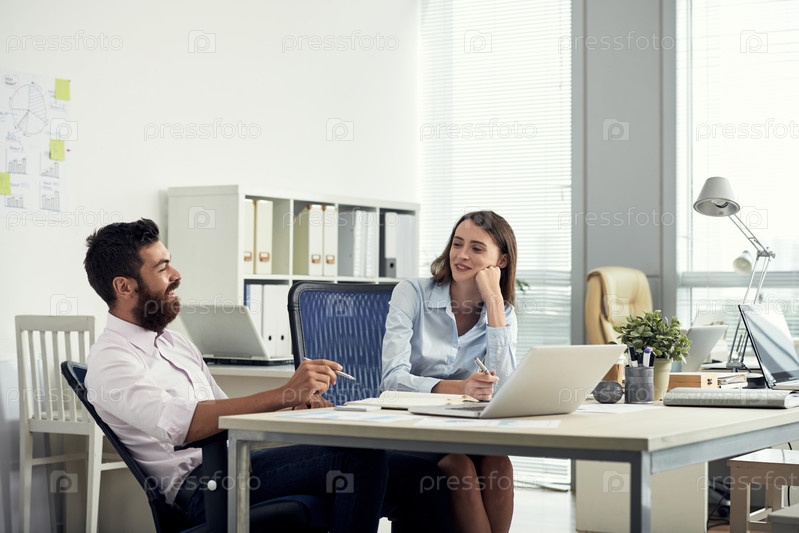 Улыбающиеся, расслабленные коллеги разговаривают в офисе