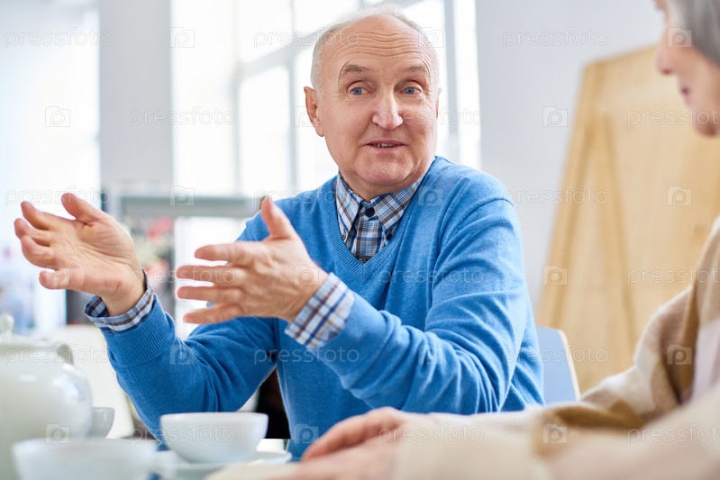 Пожилой мужчина разговаривает с друзьями в доме престарелых