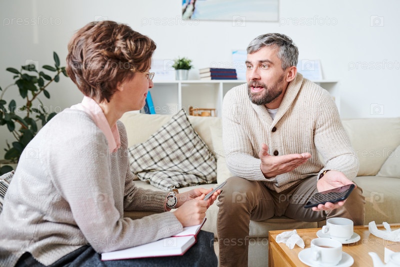 Эмоциональный мужчина показывает смс, обсуждая это с психологом