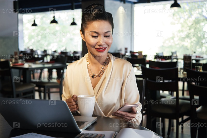 Улыбающаяся азиатская женщина использует смартфон в кафе