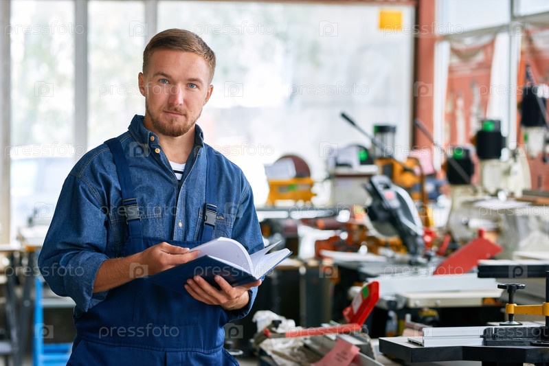 Работник, стоящий в выставочной комнате машинных единиц