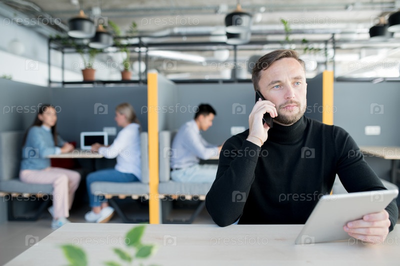 Пенсивный успешный менеджер разговаривает по телефону