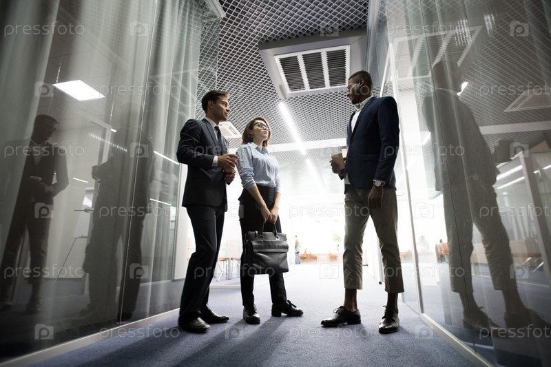 Вдумчивые работники бизнеса пьют кофе в коридоре офиса