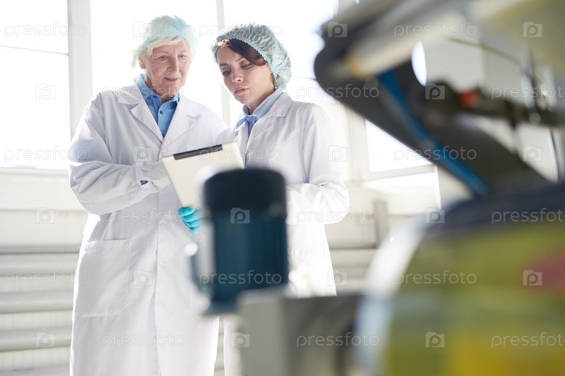 Работники работают с машиной на фабрике