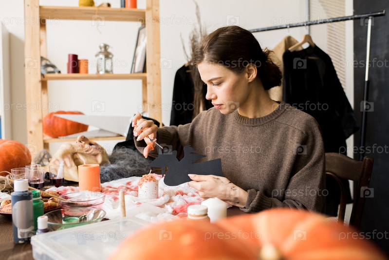 Serious craftswoman making Halloween decoration Серьезные ремесленницы делают украшения на Хэллоуин