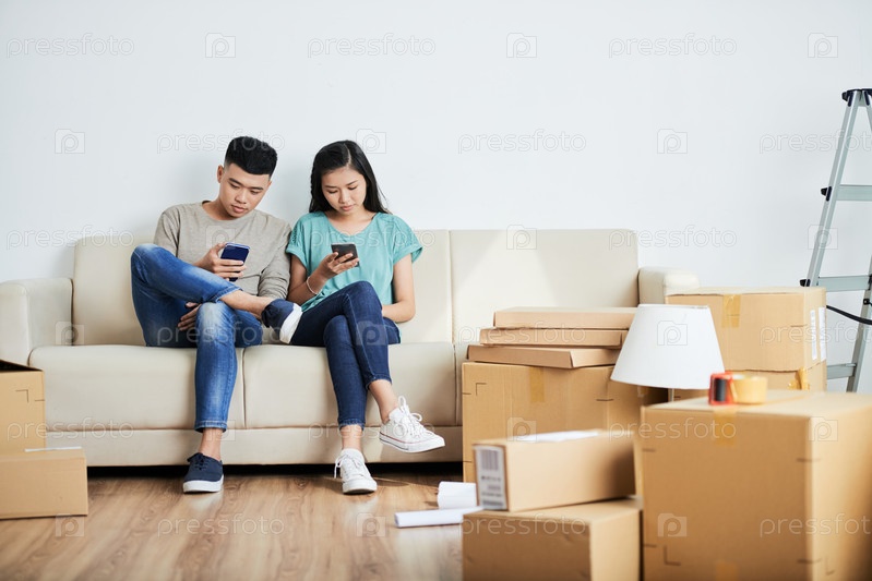 Пара, использующая смартфоны сидя в новой квартире