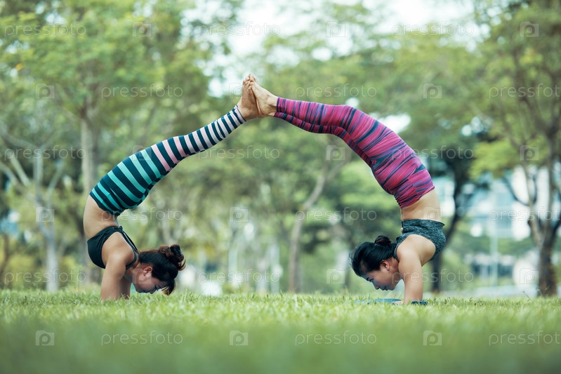 Гибкие молодые азиатские женщины, занимающиеся акройогой на свежем воздухе