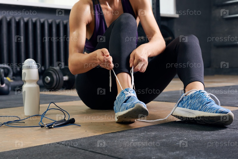 Спортсменка, завязывающая обувь Closeup