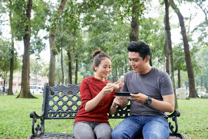 Пара ест уличную еду