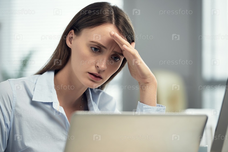 Сбитая с толку женщина смотрит на компьютер в офисе