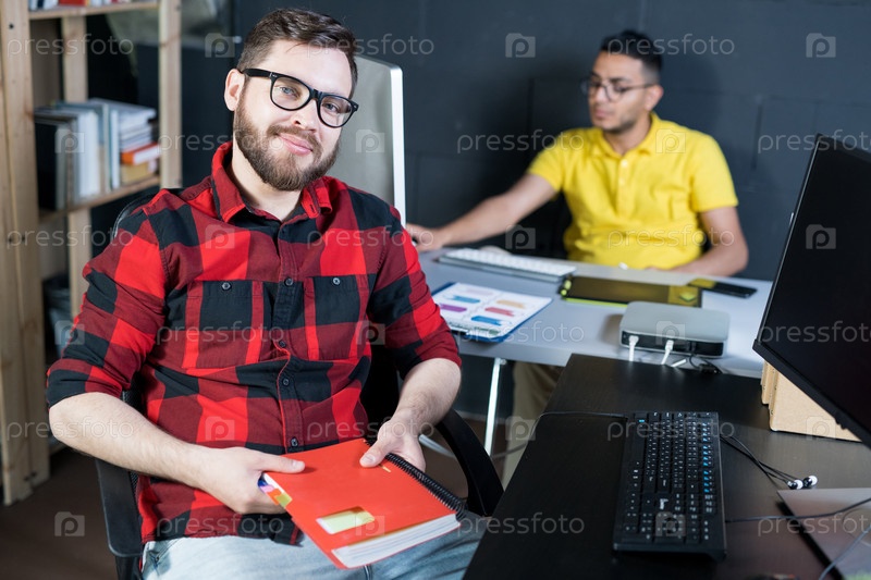 Творческий молодой ИТ-разработчик позирует в офисе