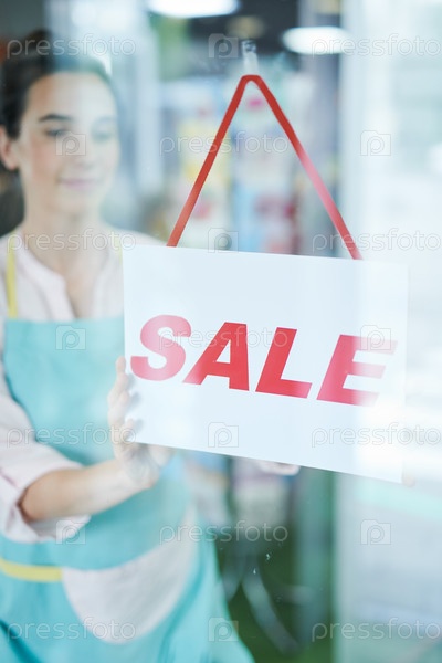 Магазинщик вешает знак продажи на двери