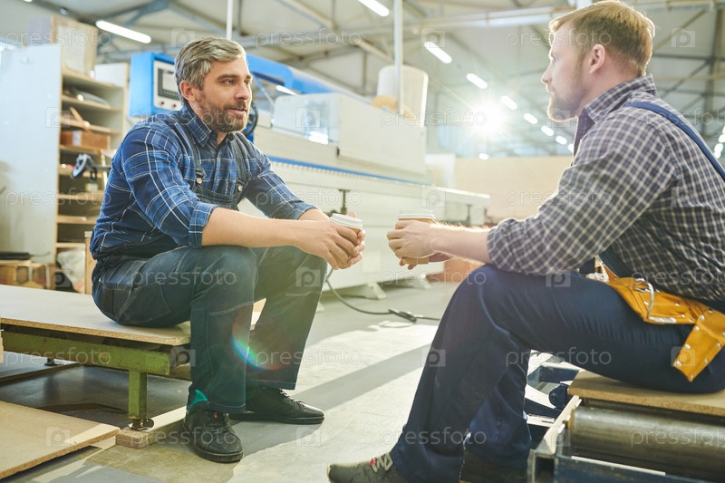 Ручные рабочие пьют кофе и разговаривают в мастерской