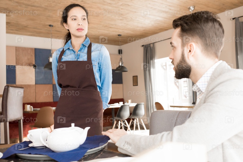 Недовольный бизнесмен жалуется официантке на обслуживание