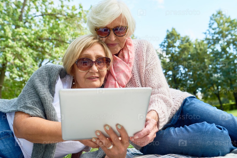 Две пожилые женщины используют ноутбук в парке